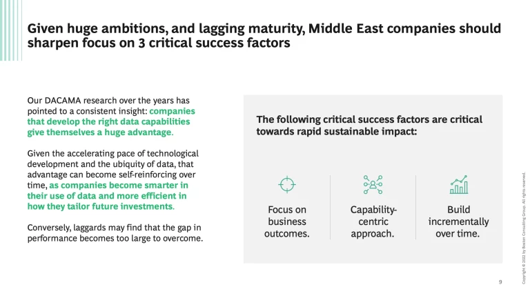 Given the accelerating pace of new technologies and data, and the rapid global focus on data maturity, companies must first ensure correct approach to data capabilities, —one that becomes self-reinforcing over time. It requires companies to become smarter in their use of data and more efficient in focused future investments. Global experience shows three factors are critical to success: