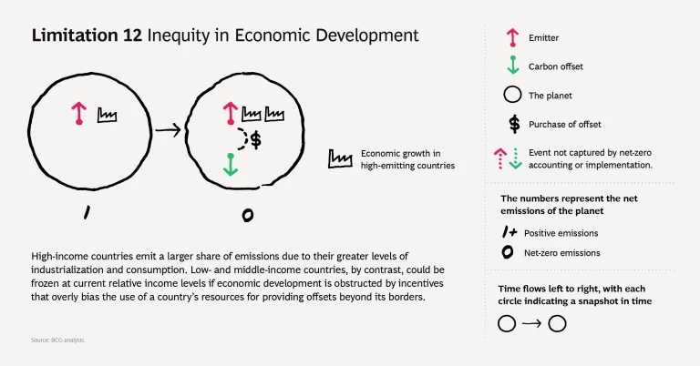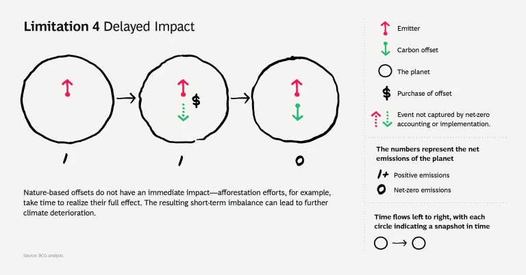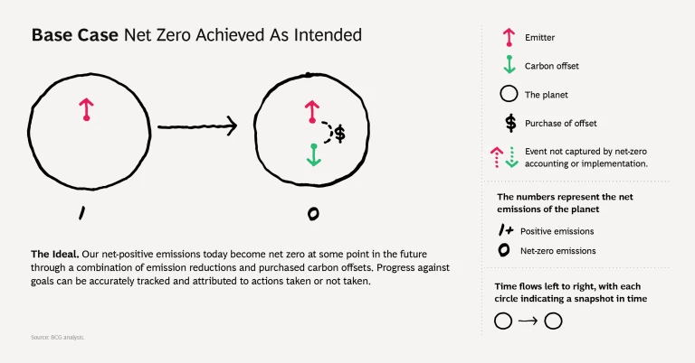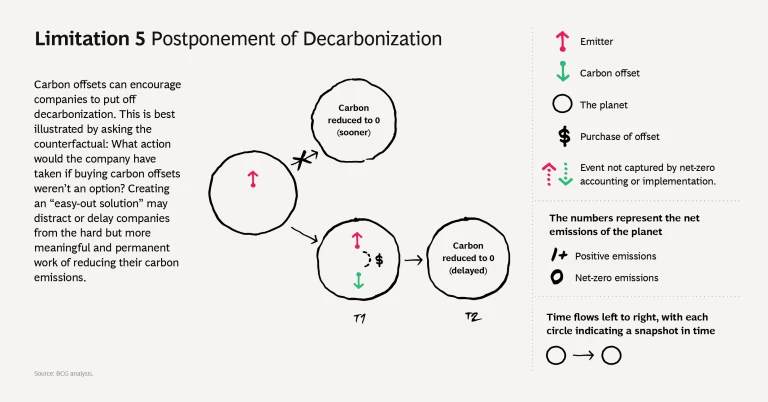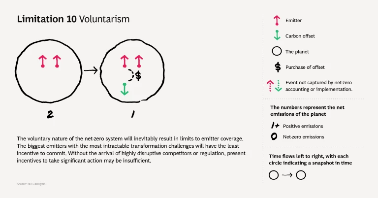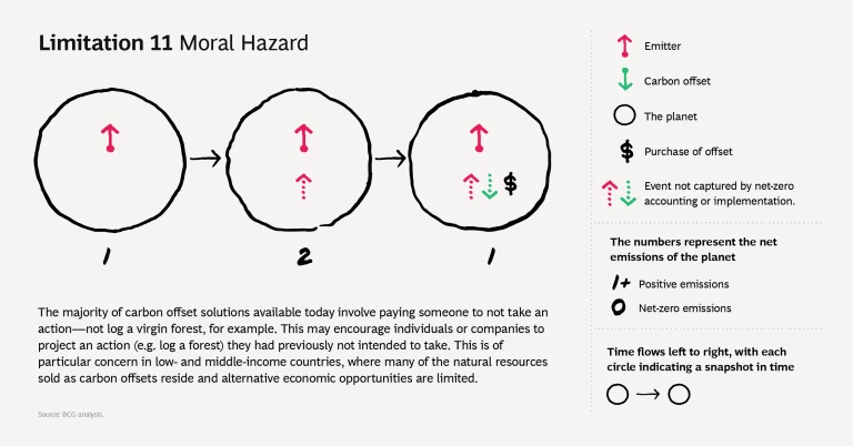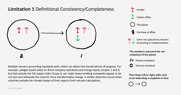 Notwithstanding the benefits mentioned, net zero has some significant gaps and limitations which need to be addressed to attain sufficient impact overall. We have captured these in a series of scenarios, all of which have examples in the present; each scenario captures a problem with definitions, implementation, or scope that can lead to emission reductions being postponed, exaggerated, or diminished. Taken together, these limitations could hinder decarbonization efforts, with net-zero pledges providing companies a false sense of accomplishment and allowing them to mistake activity for progress.