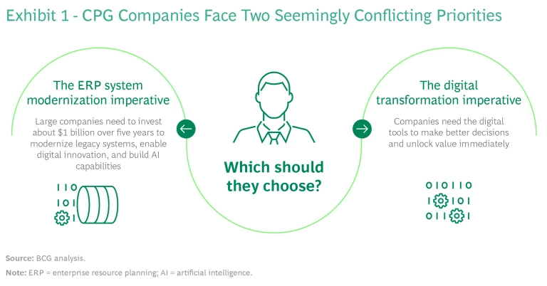 Most consumer packaged goods (CPG) companies have a dilemma. They need to upgrade their enterprise resource planning (ERP) systems—a multiyear modernization effort that will cost hundreds of millions of dollars. However, a CPG digital transformation—a near-term value-driven initiative that is increasingly urgent in order to remain competitive—is also an imperative. How do they choose which to pursue?