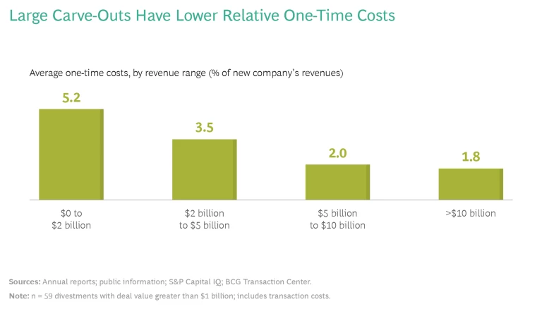 Our research indicates that total one-time costs—including those for separating and replacing technology and other capabilities and for restructuring the business—typically range from approximately 1% to 5% of the carve-out business’s revenues. Complex deals may have one-time costs that reach or even exceed 10% of revenues. Because the effort and costs involved in separating a business are often similar regardless of deal size, it is common to see lower one-time costs (as a percentage of revenues) for larger divested businesses. (See the exhibit.) Technology is usually a very significant component of these costs. As a rule of thumb, one-time costs for technology separation are typically about one to two times the size of annual technology operating expenses in highly integrated environments.