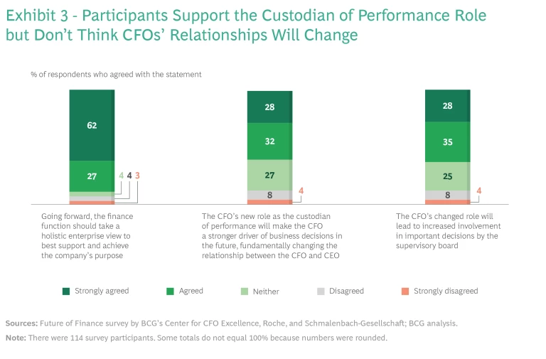 Participants embraced the concept of the custodian of performance. But they seem skeptical that CFOs’ relationships with their CEO and supervisory board will change significantly to enable this role to become a reality. (See Exhibit 3.)