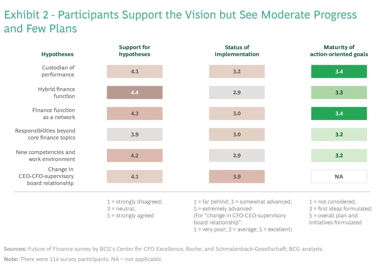 To help finance functions advance on this journey, we previously presented hypotheses for what a successful, value-adding finance function would look like in ten years. We then discussed how companies should think about evolving to ensure that they are well positioned going forward. To validate our hypotheses and understand the challenges to realizing the future vision, we surveyed corporate professionals and academics. (See “About the Survey.”) Overall, the survey participants support our vision for the future. But they see only moderate progress toward achieving it, and their planning for improvements remains in the early stages.
