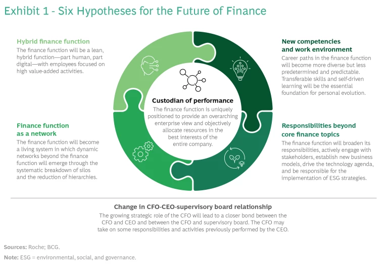 Our hypotheses for the finance function’s near-term future are intended to serve not as a universal blueprint but as an inspiration and starting point for having the right discussions. We see the finance function as a company’s custodian of performance—steering activities and resource allocation at the enterprise level to achieve strategic objectives. (See Exhibit 1.) To fulfill this role, CFOs need closer relationships with the CEO and supervisory board. Integrating human work and the digital ecosystem into a hybrid finance function is essential. The finance function also needs new ways of working in a networked organization, taking on responsibilities beyond its core topics and deploying new competencies.