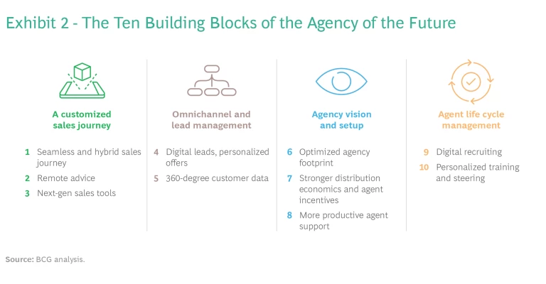 The forces are in place for transformative change in insurance distribution. BCG has generated four themes and ten building blocks that support this transformation. These ideas will shape the agency of the future. (See Exhibit 2.)