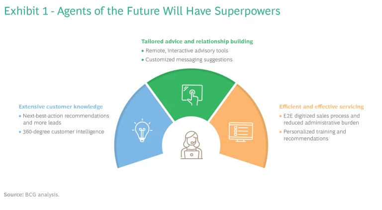 Insurance agents of the future will have superpowers, a complement of people skills and technology. They will know their customers better than ever, service and support them at key moments, and provide them with a rich digital experience. Their conversations with them will be influenced by the AI-generated insights of choices made by other customers in similar life and work situations. In short, insurance agents will be more effective. (See Exhibit 1.)