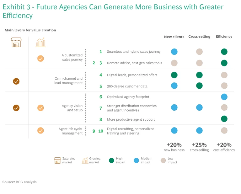 To survive, the agency channel must become more productive. Successful insurance agency transformation will pay off through better conversion of new clients, higher cross-selling rates, and efficiency improvements. (See Exhibit 3.)