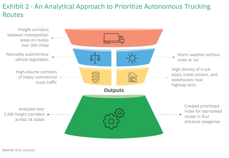 BCG GAMMA and Kodiak worked together to identify the most promising potential autonomous trucking routes between major metropolitan areas in the continental United States. We ultimately settled on five main criteria for evaluating such routes. (See Exhibit 2.)
