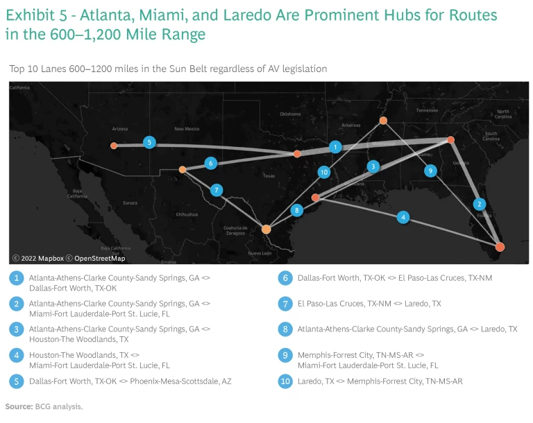 Longer routes that exceed hourly restrictions for human drivers are going to be most relevant for autonomous trucks. Looking at all routes between 600 and 1,200 miles, the dashboard shows that the top three most promising Sun Belt routes regardless of AV legislation or congestion operate through Atlanta (Atlanta–Dallas/Fort Worth, Atlanta–Miami, and Atlanta–Houston). Additional routes in the top ten highlight connections with critical intranational distribution hubs (Dallas/Fort-Worth and Atlanta), international port cities (Miami and Houston), and border cities (Laredo and El Paso). Congestion may be a concern with several of these hubs, but all provide a high density of truck stops and warehouses to support autonomous trucking operations. (See Exhibit 5.)