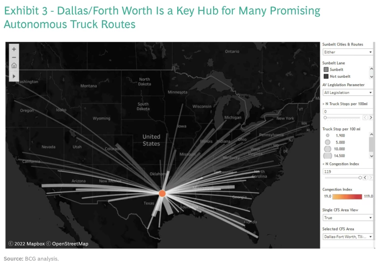By ranking routes based on scores generated by the prioritization algorithm, the tool provides interesting insights. In Kodiak’s case, the dashboard helped the company validate its decision to make Dallas/Fort Worth its initial base of commercial operations. (See Exhibit 3.) The tool showed that Dallas/Fort Worth has the highest Class 8 truck volume in the country. Many of the highest-ranking routes identified by the dashboard had Texas as an endpoint, including intra-Texas routes such as Dallas/Fort Worth to Houston, Austin, and San Antonio, as well as interstate routes including Dallas/Fort Worth to Atlanta and to Los Angeles.
