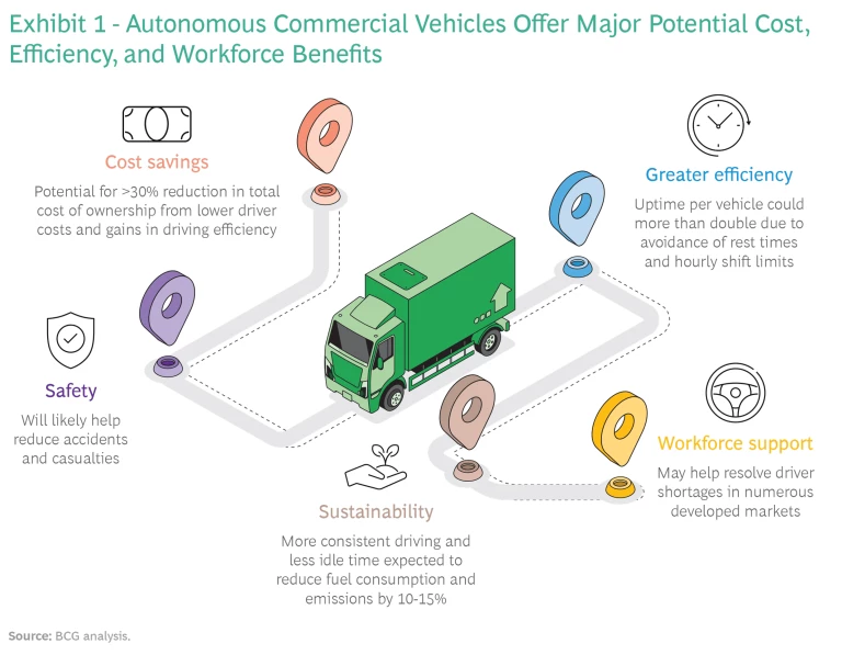 The financial case for autonomous trucking is also compelling. Autonomous driving technologies could reduce the total cost of ownership (TCO) of long-haul trucking by more than 30% through labor savings and driving efficiency gains. Because trucks would no longer have to sit idle while their drivers rest due to shift limits, vehicle utilization could more than double, dramatically increasing productivity. (See Exhibit 1.)
