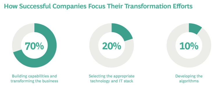 Business leaders should also oversee the implementation, which should mostly focus on change management. According to BCG’s research, the most successful digital transformations focus 70% of their efforts on building capabilities and transforming the business, 20% on selecting the appropriate technology and IT stack, and 10% on developing the algorithms. Employees from operations also need to be involved so that they can help fit the solution to their needs, learn how to use the new technology, and commit to it.