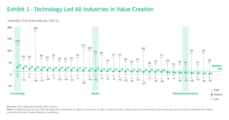 The lion’s share of that value creation came from tech players. In the five-year period analyzed for the 2022 Value Creators rankings, the tech companies in our overall TMT sample had a median total shareholder return (TSR) of 30%, more than double the median overall return of 13% for the 33 industries we study. (See Exhibit 1.)