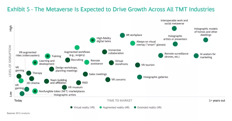 Develop a metaverse strategy. Over the next decade, the metaverse—an interconnected reality that seamlessly weaves virtual, augmented, and extended experiences into our physical world—is expected to pervade business, our private lives, and social interactions in many forms. (See Exhibit 5.) By some estimates, the size of the metaverse as a market could reach $1 trillion by 2030.