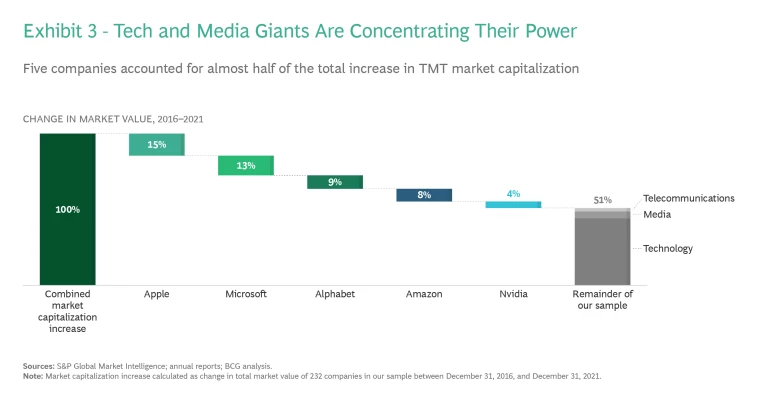 In terms of absolute value creation, the performance of a handful of digital giants had an outsized influence on the overall increase in the TMT sector’s market value. Five companies—Apple, Microsoft, Alphabet, Amazon, and Nvidia—accounted for almost half of the group’s entire increase in market capitalization. (See Exhibit 3.)