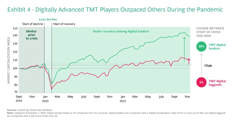 Adopt highly mature digital capabilities. Companies in all industries, including TMT, need to embrace digital. TMT leaders adopt a bionic form of organization that combines the strengths of people and technology to create highly mature digital capabilities. Although many TMT companies adopted these capabilities early on, others lag behind. But the model is worth pursuing because it can lead to improved performance. That’s according to BCG’s Digital Acceleration Index (DAI) analysis, which ranks digital maturity across 36 performance indicators, including revenue growth, time to market, cost efficiency, product quality, and customer satisfaction. The superior performance of TMT companies that are digital leaders was underscored during the pandemic, when those businesses vastly outperformed digital laggards. From February 2020 to November 2021, market capitalization for digital leaders grew 36%, compared to 5% for digital laggards. (See Exhibit 4.)