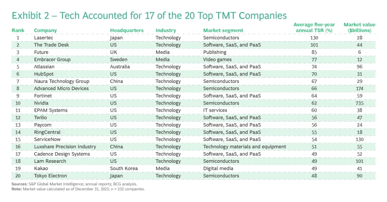 For the full five-year time frame, tech companies accounted for 17 of the 20 TMT companies with the highest TSR. (See Exhibit 2.) Dominating the cohort of leading tech companies were software and semiconductor businesses, including Lasertec, which topped the list. The Japanese company makes equipment for testing and inspecting the semiconductors used in cellphones and other devices. It’s the world’s leading supplier of photomask inspection machines, which detect errors in advanced computer chips. Demand from major chipmakers for its technology caused the company’s revenue and net income to spike over the past several years, resulting in a five-year average annual TSR of 130%.
