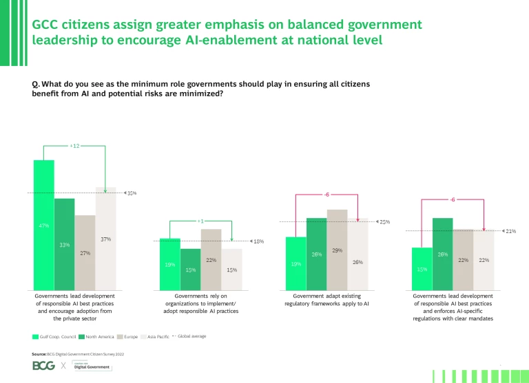 Artificial intelligence (AI) is not a service itself, but rather a key enabler of increasing personalization and proactivity. Similar to digital ID, it is increasingly prevalent in the future of digital government services and engenders certain privacy concerns. When asked about the type of AI management and oversight they would favor for digital government, 47% of GCC citizens clearly prefer a government-led approach to defining an AI best practice and encouraging the framework adoption (Exhibit 4), with a responsible AI framework* being at the center. Other regions also prefer a similar approach but do not converge as much on a single AI-led approach.