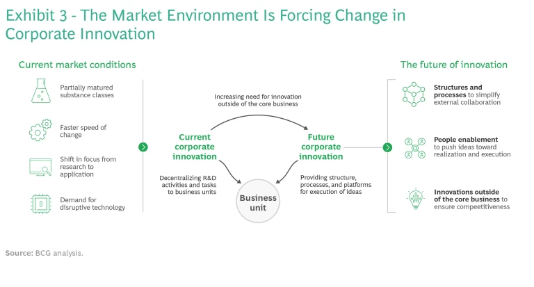 The new approaches also require better working relationships with external partners, even long-standing suppliers or customers. You will have to provide guidance, maintain standards for quality and collaboration, and develop a framework for multidisciplinary innovation. As budgets are dedicated to crowdsourcing platforms, shared innovation centers, venture funds or joint ventures, and other projects may lose funding. Therefore, existing staff must fully understand the benefits to be gained. As shown in Exhibit 3, the shifting market environment will provide a rationale and sense of urgency for making the needed changes.