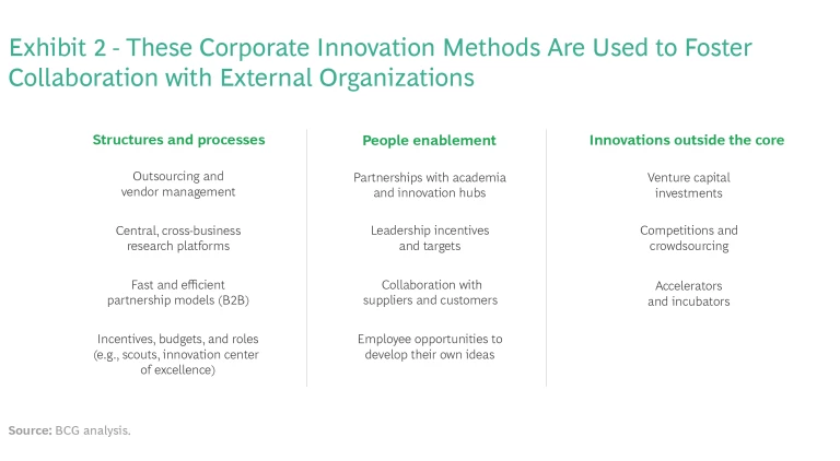 Exhibit 2 presents these methods and strategies, along with other actions that can help build the necessary capabilities and business infrastructure over time. All of these are being deployed by leading chemical companies to involve external entities in the innovation process and to capture the highest value from those engagements. Together, these methods can help a company raise its level of innovation readiness. (Innovation readiness is the capability of realizing value from R&D investment.) There may be less emphasis on traditional innovation tools, such as R&D projects based only in in-house laboratories.
