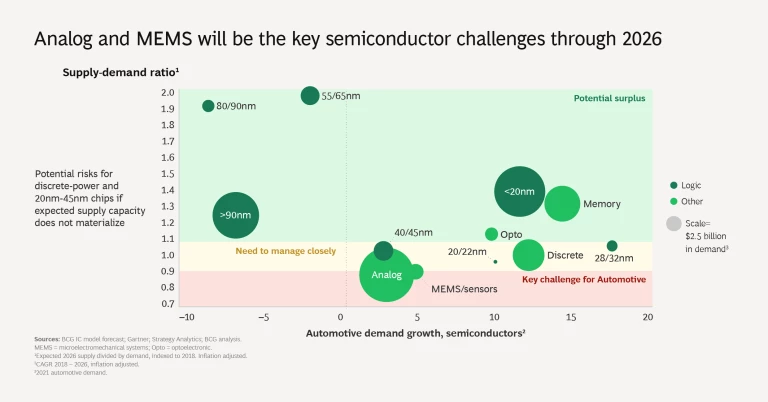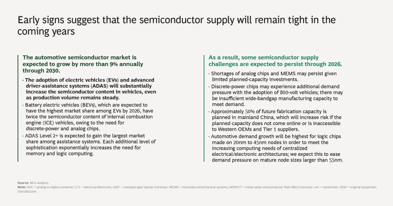 The growing sophistication of vehicles means that, despite recent capacity investments, the imbalance between chip supply and demand will persist—at least for some types of semiconductors—over the next four years. However, the nature of the chip shortages and the device types affected will change over time, requiring automakers to actively manage risks as the situation evolves.