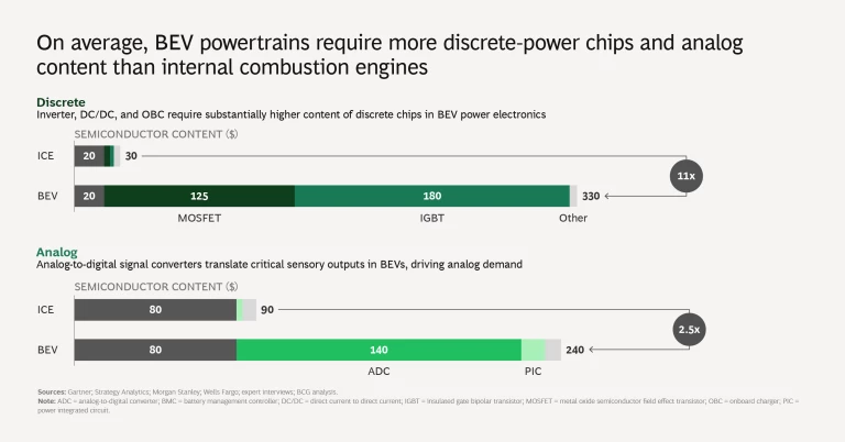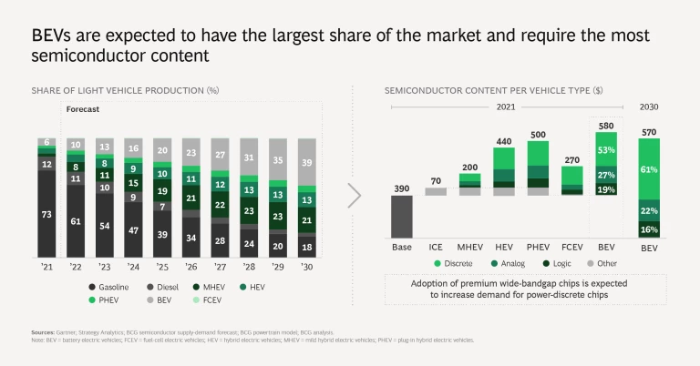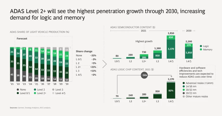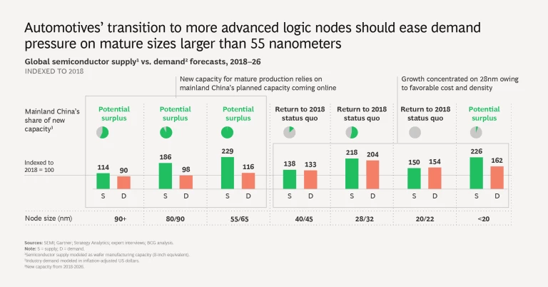 - First, to meet the needs of centralized electrical and electronic architecture as well as ADAS, auto semiconductor demand will need to shift from mature nodes above 45 nanometers to more advanced nodes as well as to wide-bandgap discrete components. Managing this transition effectively will be the difference between offering compelling new features and products and being an industry laggard.