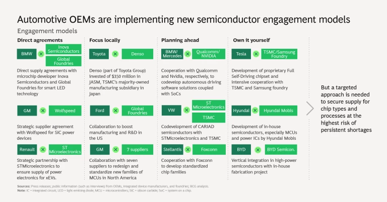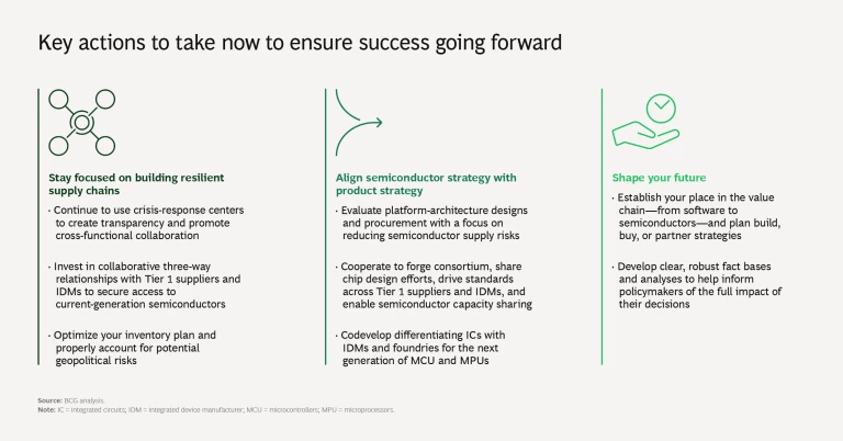 - Shape the future by establishing your place in semiconductor value chains to support your critical supply needs—including building the right win-win partnerships with chip makers and developing clear, robust fact bases and analyses to help inform policymakers of the full impact of their decisions.