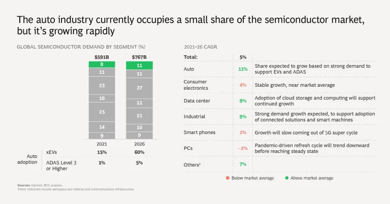 This slide show presents the findings of a BCG study that looked at trends in the automotive semiconductor market; crucially, our study disaggregated the market by chip type and manufacturing technology.