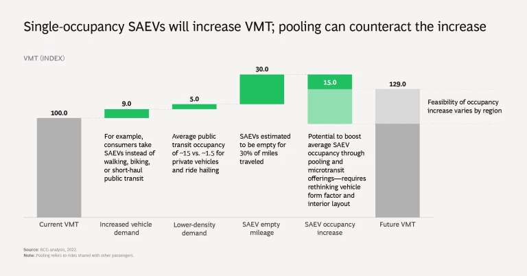 Getting it right, though, depends on effective policies and regulations. Without these, SAEV deployment could actually exacerbate pain points. BCG, in conjunction with the World Economic Forum and the City of Boston, simulated SAEV deployment in the city. We found that unregulated SAEV-based ride-hailing fleets would cannibalize public transit for shorter downtown trips and thus worsen congestion and overall mobility throughput. Policymakers need to create the right incentive structure to increase the average occupancy per vehicle (accomplished through ride pooling) beyond today’s levels and incorporate SAEVs into the public transit network as a complementary offering, not a replacement. That will tip the scales on total vehicle miles traveled, suppressing the potential increase in VMT, congestion, and pollution. (Policymakers must also work to ensure that ride pooling is a safe option; our research showed that some commuters hesitated to pool in an autonomous car because of safety concerns.)