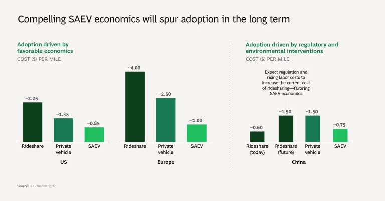 The context is different in China. There, ride hailing is already very inexpensive, so SAEVs won’t provide a better offering on economic terms—at least not today. In the future, though, we expect environmental regulations and driver protections to increase the costs of traditional ride hailing, creating an opening for SAEVs to become a more attractive option in the 2030s.