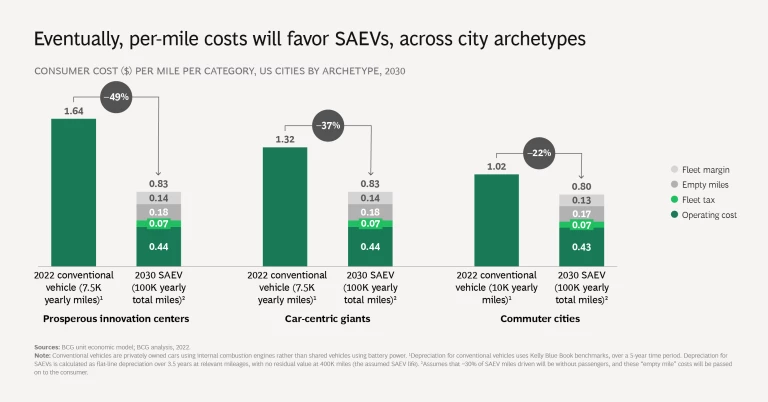 The economics are also very compelling in Europe. The per-mile cost of SAEVs will be less than half the personal-vehicle cost and a quarter of the ride-hailing cost.