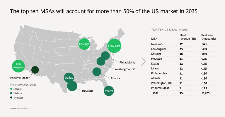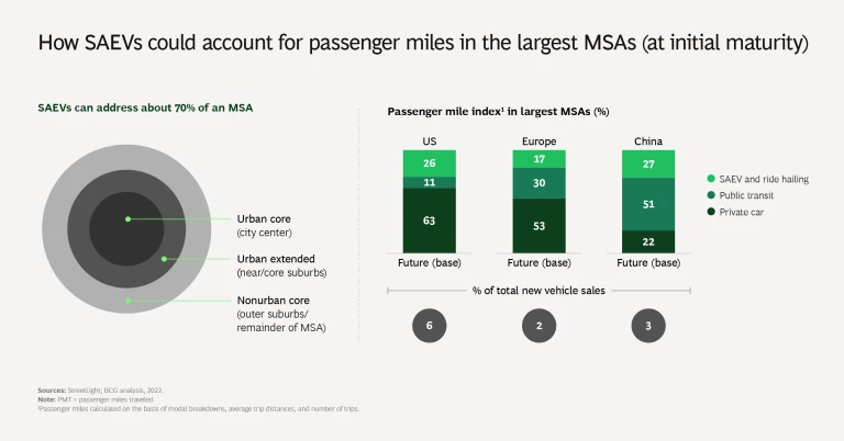 SAEV fleets won’t work everywhere. The economics are attractive only in large metropolitan statistical areas (MSAs), where consumers can be guaranteed a good level of service (for instance, a wait time for a ride that doesn’t exceed three minutes) and operators can count on profitable vehicle utilization of 70% or higher. Even within these MSAs, only 65% to 75% of miles traveled can be addressed through SAEV fleets, given drawbacks related to population density and roadway infrastructure.