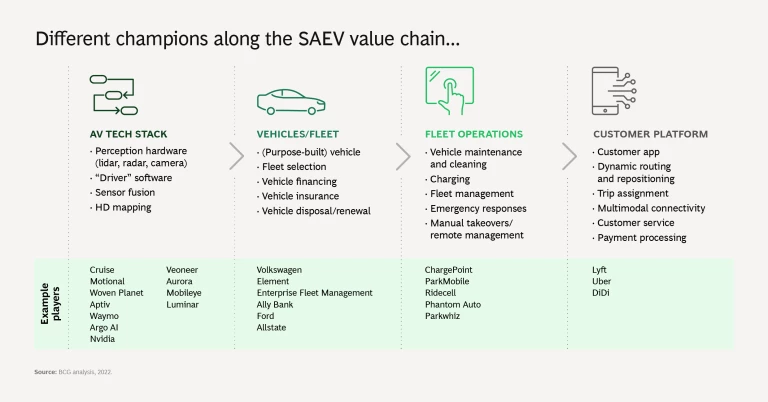 Currently, the competition to bring SAEVs to market is dominated by champions at each individual stage and value pool.