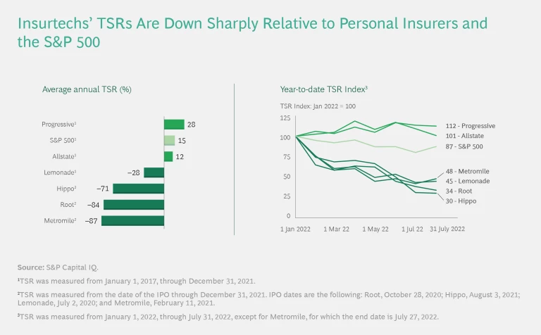 Publicly traded insurtechs, on the other hand, have all destroyed value since their IPOs, with annual TSRs of –50% to –90%. This value destruction highlights the challenges of achieving breakout profitable growth in insurance. (See “Insurtechs Must Shift Their Focus to Profitability.”) As one of many examples of the struggles insurtechs face, Hippo announced this July its intention to file for a reverse stock split after a period of noncompliance with New York Stock Exchange requirements—the company’s average closing price was less than $1 for a consecutive 30-trading-day period.