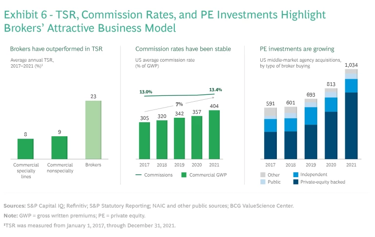 The solid performance of commercial insurers was dwarfed by that of brokerage firms, which had a five-year annual TSR of approximately 23%. (See Exhibit 6.) This might not be a perfect comparison because, in contrast to insurance, brokerage is a capital-light business with minimal balance sheet risk and strong cash-flow generation. However, it is noteworthy that brokerage commissions and fees have remained steady over the years. Proximity to customers and the scale resulting from ongoing market consolidation are important contributors to the strong position of large brokers. They allow brokers to continuously expand their breadth of services and invest in differentiating capabilities, including digital, data, advanced analytics, and technology.