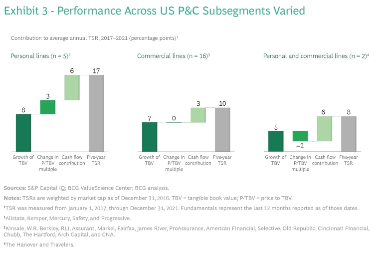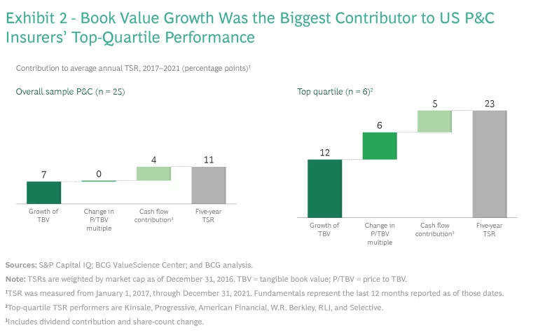 Top-quartile insurers had a five-year average annual TSR of approximately 23%, versus approximately 3% for bottom-quartile players. (See Exhibit 2.) Top insurers’ outperformance was driven primarily by stronger growth in tangible book value (TBV) (contributing 12 percentage points to TSR versus 7 percentage points for the entire US P&C sample) and multiple expansion (contributing 6 percentage points versus no contribution for the entire US P&C sample).