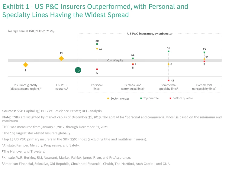 US property and casualty (P&C) insurers have weathered uncertainty relatively well in recent years. From 2017 through 2021, their average annual total shareholder return (TSR) was approximately 11%, compared with 7% for insurers across all regions and sectors. However, looking below the headline TSR figure for US P&C insurers, we see strong variations among top- and bottom-quartile performers and among market segments.