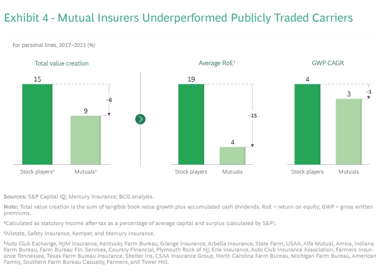 Because mutuals are not publicly traded, it is not possible to calculate their TSRs. A reasonable proxy, however, is total value creation (TVC): the sum of TBV growth plus accumulated cash dividends. From 2017 through 2021, the TVC performance of personal-lines-focused mutuals lagged that of publicly traded personal lines insurers by approximately 60%. (See Exhibit 4.) The gap is largely attributable to mutuals’ lower return on equity (4% versus 19% for stock players) and lower annual GWP growth (3% versus 4% for stock players).