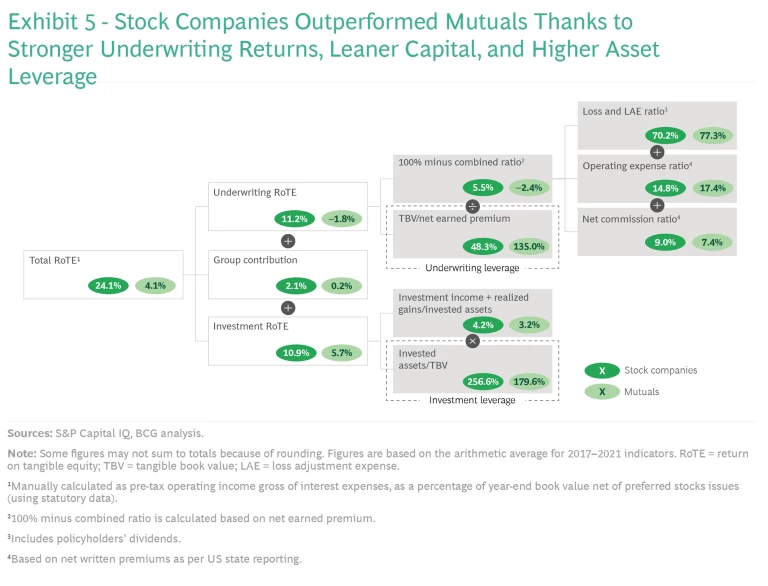 Mutuals’ RoTE is also lower, which our benchmarking shows is a function of three main factors: stock players’ better loss ratio (approximately 7 percentage points lower), better expense ratio (approximately 2.5 percentage points lower), and more efficient capital position reflected in their underwriting and investment