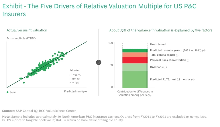Making the right tradeoffs requires an accurate understanding of the impact of strategic and operational decisions not only on TBV growth and free cash flow but also on the P/TBV multiple. BCG’s Smart Multiple methodology, an integral part of our TSR methodology, uses regression analysis to estimate differences in P/TBV multiples. (See the exhibit.) In US P&C insurance, approximately 85% of the variance in a company’s P/TBV multiple can be explained by fundamentals: profitability metrics (such as RoTE), dividends, business mix (personal-line concentration), balance sheet health (debt to capital ratio), and predicted revenue growth. When we help an insurer chart a course for superior shareholder value creation, we develop a plan that accounts for the tradeoffs among the TSR drivers (TBV growth and free cash flow, for example) and the expected impact of each factor on the client’s P/TBV multiple. Our analysis also considers risks and long-term strategic implications.