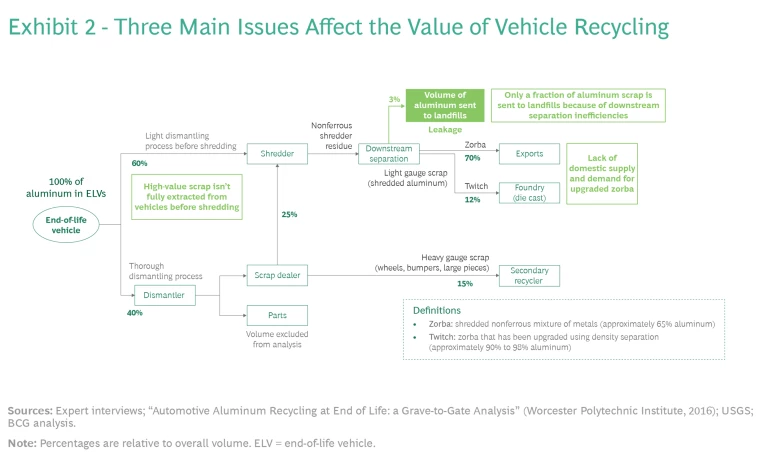 Most automotive scrap yards are small, independent operations focused on creating high volumes and keeping costs low. While the most valuable components in an end-of-life vehicle are removed and processed by a specialist dismantler, 60% of the vehicle by volume is only lightly dismantled before being shredded and turned into scrap, resulting in a low-quality mixture of aluminum, other metals, and nonmetallic matter. (See Exhibit 2).