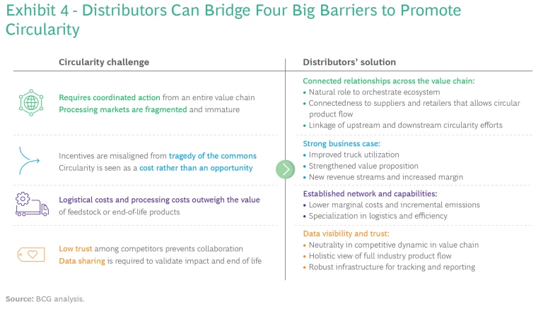 Much of the opportunity for distributors is rooted in their ability to overcome four of the biggest barriers to greater circularity. (See Exhibit 4.) Here’s a look at each one.