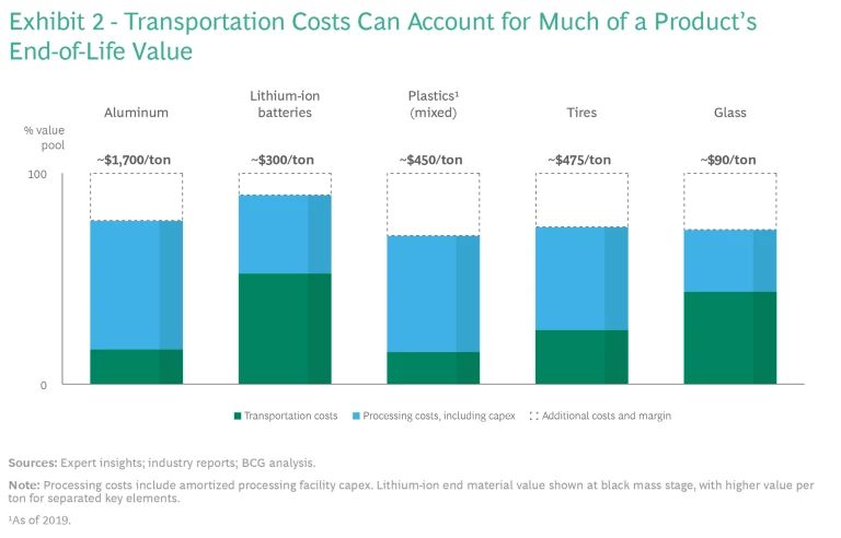 High-value, moderately concentrated waste often is not recycled because of the difficult logistics involved. The materials can be subject to a patchwork of regulations or require specialized handling capabilities. For other waste such as scrap tires, recycling is limited because rubber, steel, and carbon black have relatively little value. Transportation costs account for varying degrees of the end-of-life product value pool. For some product categories, such as lithium-ion batteries, these costs are substantial. (See Exhibit 2.) Still, there is an opportunity to extract value from these types of waste streams for those that develop the necessary expertise (which also serves as a high barrier to entry for competitors) or have a built-in advantage, such as the ability to leverage existing transportation networks.