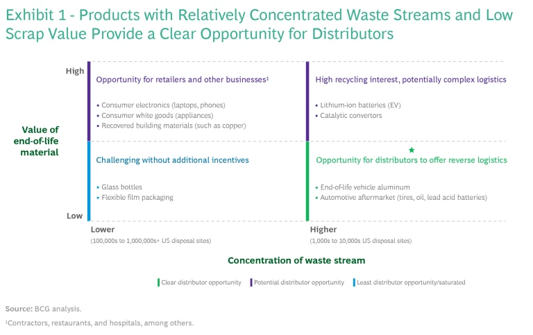 Gaps between supply and demand are good for companies that can build the necessary bridges. But this is not always easy for recycling and circular use as economic factors can undercut the attractiveness of the market. Two of the biggest barriers for circularity are the value of the end-of-life materials and the concentration of waste streams. (See Exhibit 1.)