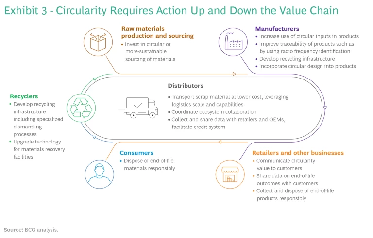 Distributors are squarely placed to use their industry position and relationships throughout the value chain to orchestrate this kind of collective endeavor, in which action at all stages is required to overcome the barriers at each one. They can boost their own businesses by taking advantage of their access to a large universe of waste suppliers on one side and a large market of buyers or users of the waste on the other. Distributors can collect and transport scrap material at lower cost than any other participant by leveraging their logistics scale and capabilities. They can aggregate demand for products with circular potential from retailers and motivate circular design by manufacturers. They can also facilitate ecosystem collaboration and efficiency by serving as a neutral third party and data-sharing hub for retailers and OEMs.