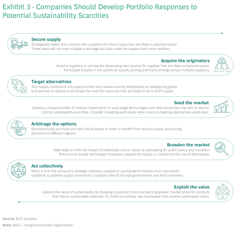 Ensuring the Availability of Sustainability Resources. As more and more of the world’s largest businesses develop new products and processes and redesign existing ones to reach sustainability targets, bottlenecks and scarcities are highly likely to emerge for critical inputs. To avoid being locked out, leaders need to identify where sustainability scarcities may emerge in their ecosystems and develop a robust set of portfolio responses to mitigate them. (See Exhibit 3.)