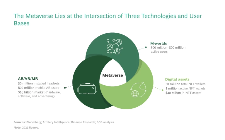 While there’s no official definition of the metaverse, it’s helpful to think of it as emerging from three important technology trends, both individually and via their intersections (see Exhibit 1):
