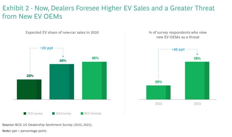 Our latest forecast has EV penetration of new car sales in the US at nearly 50% in 2030. Last year, dealer expectations regarding 2030 EV sales lagged that forecast significantly at only 26%. In this year’s survey, however, dealers came in 20 percentage points higher, bringing their expectations close to ours—a sizeable shift from bearish to bullish in just one year, likely fueled by the passing of the Inflation Reduction Act and its associated purchase incentives of up to $7,500 per EV. At the same time, the share of surveyed dealers who consider new EV OEMs (the likes of Tesla, Rivian, Polestar, and Lucid) to be a real threat to their own business has jumped by 50 percentage points. (See Exhibit 2.)