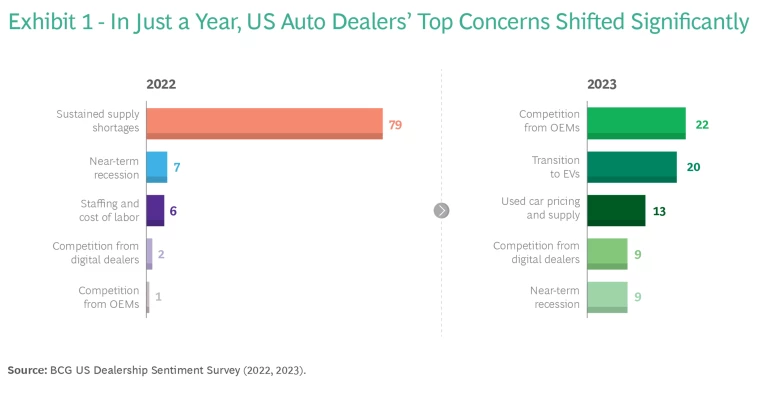 In 2023, the biggest concern for US auto retailers is the competitive dynamic with OEMs, whether traditional OEMs looking to evolve their franchise distribution models or new OEMs focused on electric vehicles (EVs); new EV OEMs are changing the landscape with direct-to-consumer (DTC) or agency retail models. The rise of EVs themselves brings other key concerns for US retailers—required investments in charging infrastructure and staff training, for example—especially given the accelerated pace of the transition to battery-electric vehicles.