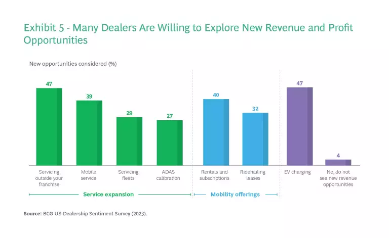 Dealers are looking at the potential to make up for lower service revenue streams in several ways. (See Exhibit 5.) Nearly half plan to actively push servicing other makes beyond their franchise brand. Close to 40% of dealers are looking to monetize a mobile service offering, and just under 30% are banking on incremental business from servicing fleets and charging for calibration of sensors on vehicles with advanced driver assistance systems (ADAS).