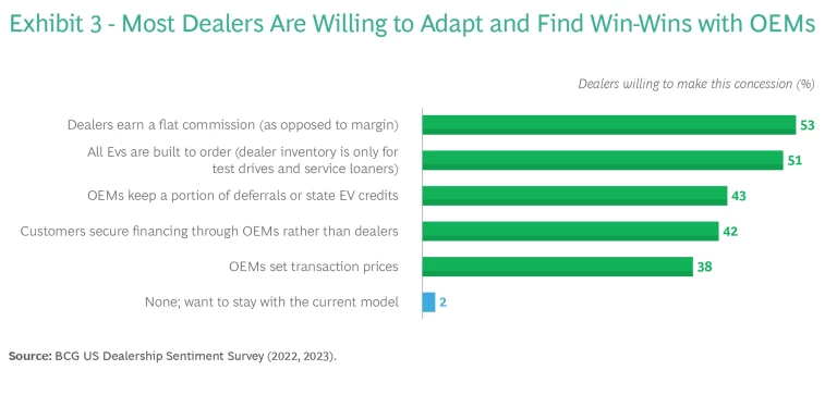 US franchise dealers feel this pressure, and several have pursued legal action to push back against the OEM changes. But our survey found that a vast majority of dealers (98%) are willing to make at least some concessions to OEMs in an attempt to find win-win scenarios and jointly define a new normal in the relationship. There is not a lot of consensus (yet) as to what the right terms of engagement shall be going forward, with none of the surveyed options eliciting more than 53% of dealer acceptance. (See Exhibit 3.) In return for such concessions, however, dealers expect to receive uncapped access to OEMs’ full product portfolio as well as greater support on the capital-intensive charging infrastructure and staff training that they need to sell EVs.